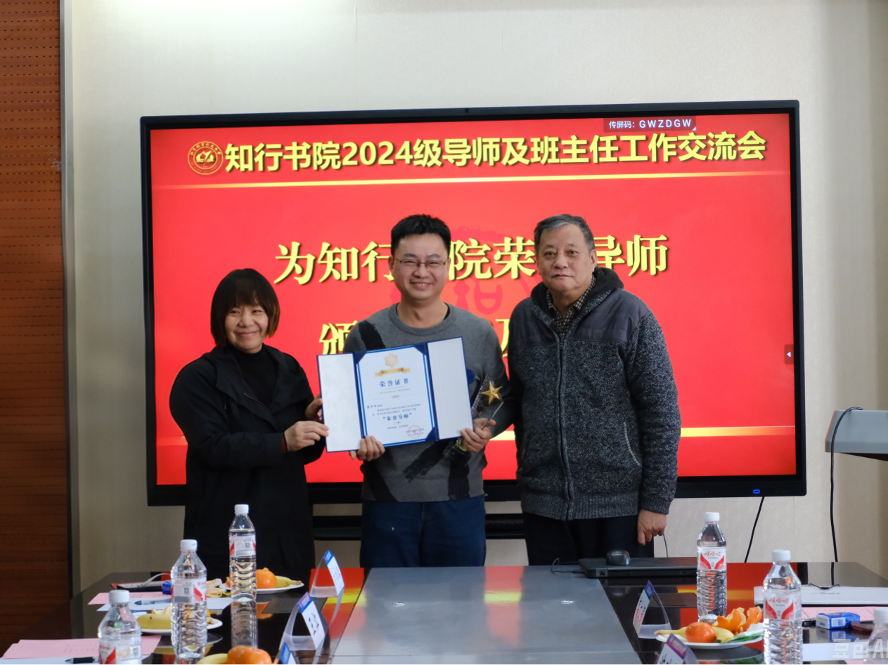 随后举行了知行书院荣誉导师颁奖仪式。在书院工作满五年的导师将获评知行书院荣誉导师(一星)称号,每满五年加一星。今年来自人文与社会科学高等研究院康子兴老师和法学院王天凡老师获得知行书院荣誉导师(一星)称号,郑晓齐院长与沈映春老师为到会的荣誉导师康子兴老师颁发证书及奖杯。康子兴老师分享了自己在五年导师工作中的经验和感受,他表示导学活动可以让师生双方获得“滋养”,需以平等视角倾听学生需求,在建立深厚情谊的同时帮助学生缓解成长焦虑。