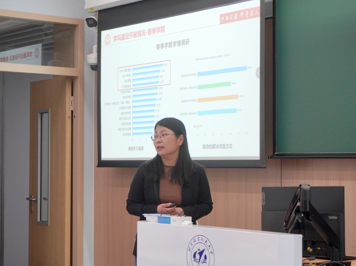 会议伊始,学业助理李玉华老师汇报了知行书院春季学期学风建设情况,内容包括学业支持工作体系建设方案、学风建设开展情况以及本学期工作安排。本学期知行书院学业与发展支持中心继续依托“三阶段—两层次—一贯通”的学业支持体系,开展了集体自习答疑串讲、最美笔记大赛等学业支持活动,开发了《统计学导论》AI智能答疑系统,为打造知行书院优良学风提供了强有力支撑。