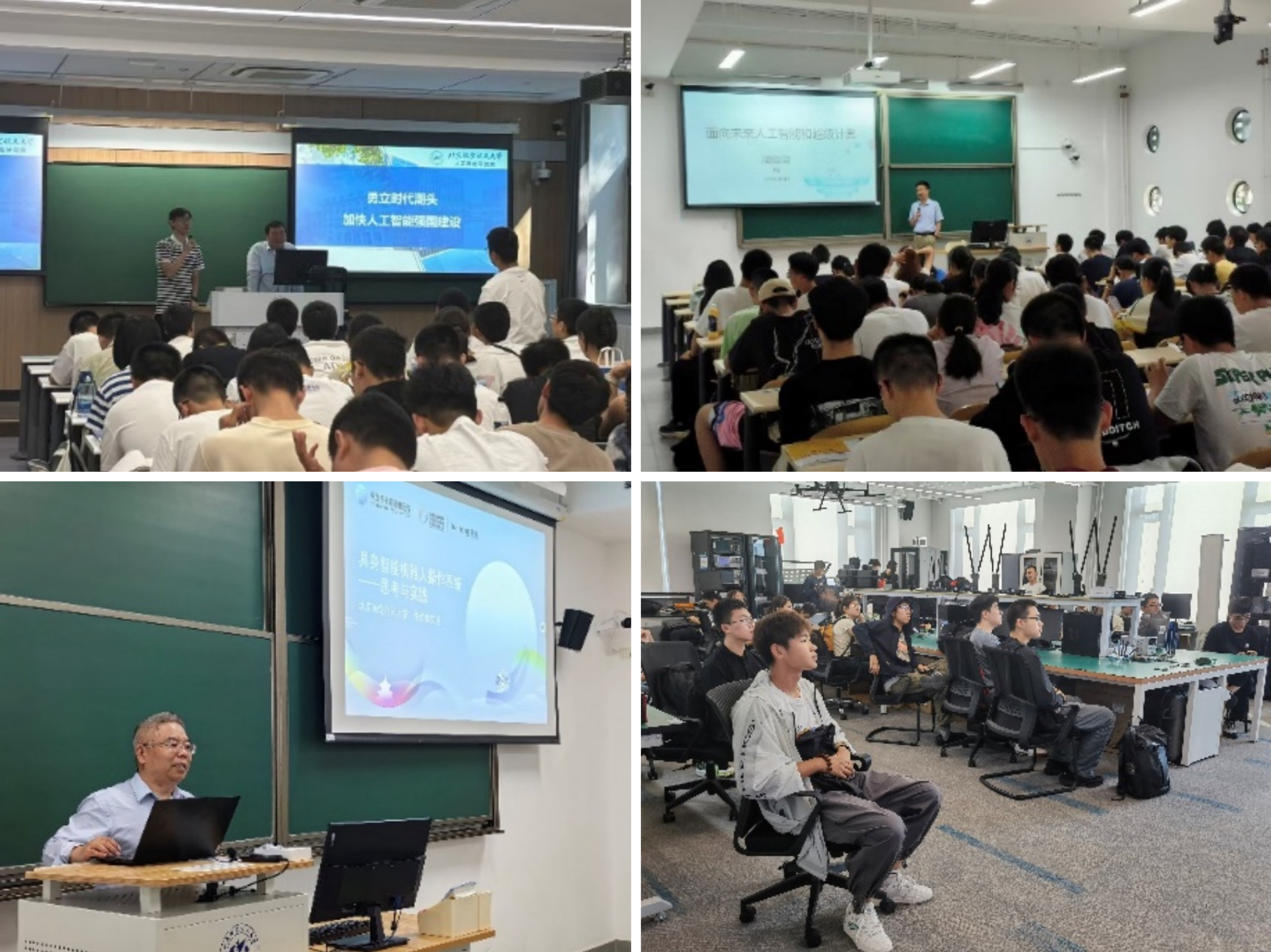 计算与智能科学类各专业学院带领同学们深入学院重点实验室,近距离接触行业前沿技术与科研成果。计算机学院李波老师为同学们作《面向未来人工智能和超级计算》主题讲座,深入探讨了AI的局限性,同时强调了计算机学科与其他领域的跨学科合作潜力,并指出计算机学科与多学科交叉的重要性,展示了其在推动科技进步中的关键作用。软件学院副院长谭火彬老师介绍金沙集团1862cc橙色与培养方案,牛建伟、盛律、于茜、张晶四位老师分别分享了具身智能与机器人融合、大小脑协同模型、大模型赋能矢量图与草图理解、多模态大模型驱动Web UI Agent等前沿技术。网络空间安全学院高年级学生带领一年级新生参观各类实验室,沉浸式体验网络空间对抗与舆情管控的实战场景,近距离感受AI社交机器人账号的存在与舆情引导原理。人工智能学院(人工智能研究院)吴文峻老师以图灵测试等案例阐释了AI的概念与能力并回顾发展历程,强调了需求、算法、算力协同的重要性,重点介绍学院五大方向以及取得的重大成果,并向同学们介绍了学院以基础理论为核心、结合多领域技术与应用的育人体系。