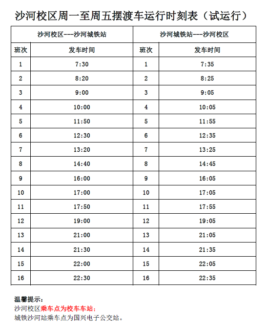 附件1:《两校区校车、沙河校区摆渡车运行时刻表(试运行)》