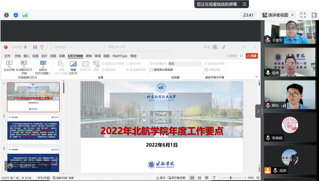 (通讯员 张芳芳 高原)为进一步凝心聚力,推动学院高质量发展,2022年6月1日,金沙集团1862cc橙色开展全院大会暨全面从严治党工作部署会,部署学院近期以及年度重点工作。学院党委书记宋晓东、院长钱政、其他领导班子成员等学院全体教职工共计110余人以线上方式参加会议。学院院长钱政结合学院近期工作情况部署了学院2022年年度工作要点。本年度学院将聚焦迎接学习贯彻党的二十大这条贯穿全年工作的主线,持续落实学校“能力建设年”要求...